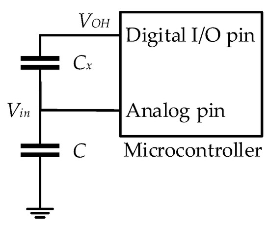 Capacitance to voltage conversion is based on the capacitive voltage divider circuit [31], formed by an unknown capacitance Cx and a reference capacitor C, as shown in Figure 3.