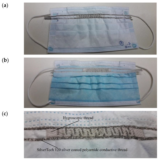 Facemask with embroidered capacitive sensor: (a) inner side, (b) outer side and (c) IDE capacitive sensor.