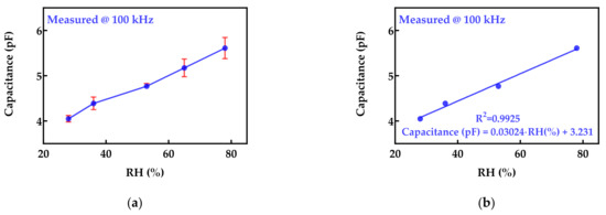 Using the measured value that was included in the calibration process (65% RH) and Equation (5), the expected sensor capacitance was calculated as 5.19 pF, while the measured value was 5.17 pF. Therefore, a relative error lower than 0.5% was obtained. Moreover, the coefficient of determination (R2) was calculated as 0.9925. The plot of the measured and fitted values is shown in Figure 6b.