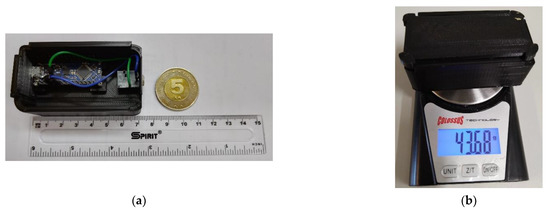 We used a microcontroller board with the ATmega328P microcontroller. The internal ADC has a 10-bit resolution (1024 quantization steps). With a 16 MHz clock speed, the prescaler of ADC clock was set to 1/128. Therefore, as each conversion takes 13 ADC clocks, the maximum sampling frequency can be 9615 Hz [35]. The used microcontroller board is a very economical solution, costing less than USD 15 [36]. The microcontroller board is placed in the custom-made 3D-printed protective case. The hardware layout of the readout system is shown in Figure 7a. A ruler next to the device and a five euro coin are also shown in Figure 7a. The developed device is intended to be worn throughout the entire duration of the testing (which takes approximately 2 min). As a result, the lightweight property was very important to achieve. The total weight of the final unit, composed of the microcontroller and the 3D-printed case, is less than 44 g (Figure 7b).