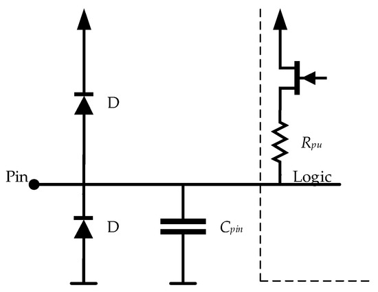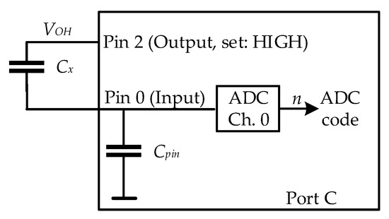 As the ATmega328P microcontroller has internal capacitance (Cpin) associated with each input/output (I/O) pin, as shown in Figure 8, our approach is to use that capacitance as the reference capacitor, instead of adding an external one. Such an approach reduces parasitic phenomena, as well as the overall price and dimensions of the readout system.