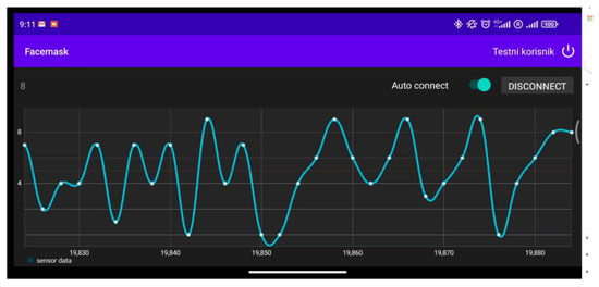A screenshot of the main screen of the developed facemask application for the Android™ operating system is shown in Figure 10. After starting, it shows a login screen requiring a username and password, which is a mechanism for enhanced security in cases of remote data collection, as it prevents unauthorized access to the data collection process. The main screen is composed of a button for establishing a connection with the current status label (connect/disconnect), a slider for the auto connect option in which the application scans the USB port to check if connected peripheral has an appropriate FTDI chip, and a main part for the graphical presentation of the received data. In the background, the application sends data to the remote server for storage and further processing.