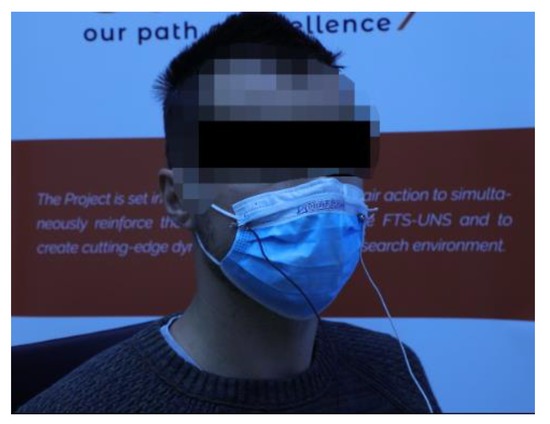 For testing purposes, a healthy volunteer subject was also included. The volunteer signed informed consent before the tests. The subject was instructed to sit in a chair and rest for approximately 3 min, which was followed by tests. A volunteer wearing a facemask with the embroidered capacitive sensor is shown in Figure 12.