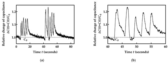 The value for C0 was determined as the first value obtained at the beginning of the measurement. As the value for C0 can slightly differ from one subject to another (given how the facemask is being worn due to the face constitution, which causes different ratios of exposure to environmental and exhaled air, as well as due to different levels of bending), this parameter was only used for the calculation of the relative change in sensor capacitance over time, rather than using its absolute value. Such an approach reduces the possibility for wrong data interpretation. The measured values are shown in Figure 11. As shown in Figure 11, fluctuations were lower than 1%, indicating the very good stability of the sensor readout values.