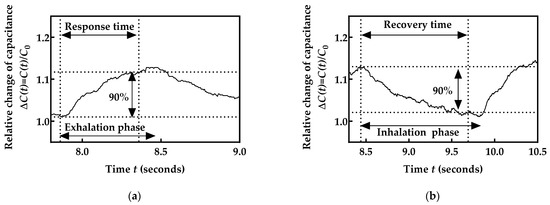 When compared to the respiratory belts, which are come in the form of piezo-resistive sensors [10,17], resistive strain sensors [11], inductive strain sensors [12], textile capacitive force sensors [13], or bio-triboelectric nanogenerators [38,39], the advantages of our system are primarily as follows: simpler readout electronics and elimination of abdominal and chest breathing interference because our system is based on breath air analysis. The same limitation of the textile-wearable capacitive sensor is also resolved [16].