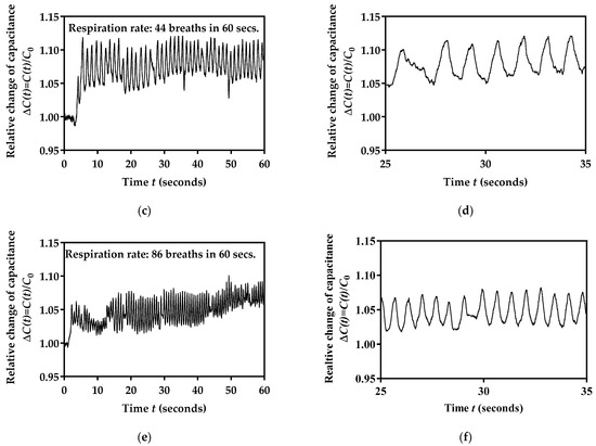 Figure 15 shows that the designed facemask sensor can provide information about the nature of the breaths being taken. For example, at higher breathing frequencies (Figure 15e,f), the signal seemed to be smaller for each breath. This can be explained as the relative change in the capacitance is smaller for faster exhalations, because shallower breaths may draw up less moisture from the lungs, leading to smaller changes in humidity and, consequently, capacitance changes. The importance of this is the possibility to differentiate between shallow and deep breathing, as well as the rate of breathing, which could be very important for various medical diagnostic applications, such as asthma and emphysema, or monitoring lung capacity as a first preliminary indication of COVID-19 infection. The presented system enables the measurement to be performed at home, and the subject can send the recorded signal to the medical expert for detailed analysis and adequate therapy assessment.