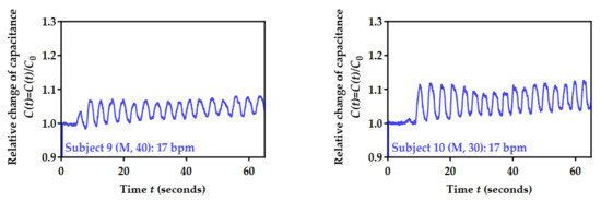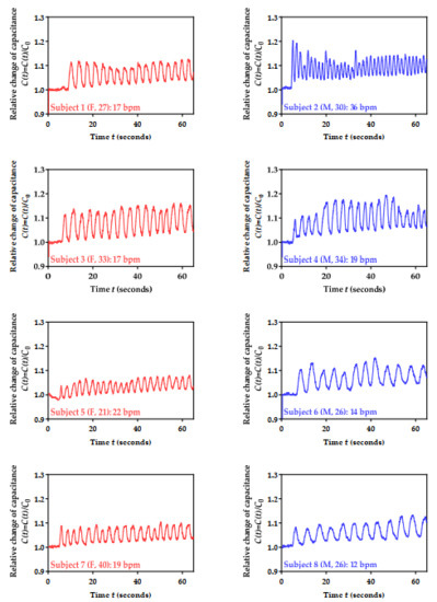 As shown in Figure 16, the data showed very good reproducibility between tests. In addition to that, some interesting data patterns could be recognized. For example, female subjects had a smaller overall increase in capacitance during respiration, which can be attributed to their physiology and smaller lung capacity. The female group also had a very similar breathing rate, with a much smaller standard deviation in bpm value (2) when compared to the male group (8). Within the latter, it can be seen that older males had a smaller overall increase in capacitance during respiration. However, it is difficult to claim that obtained results can be generalized, as a much larger number of volunteers is required for the adequate analysis and proper training of a machine learning model. Moreover, the obtained results can only be linked to the physiological conditions and breathing rates of volunteers at the moment of testing.