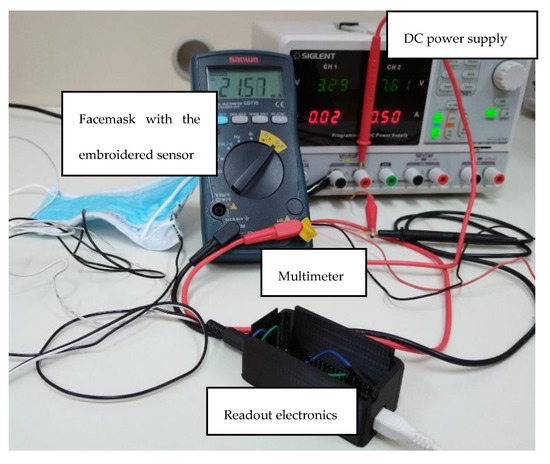 With the aim of analyzing the increase in the weight of the facemask when the capacitive sensor is embroidered into it, we performed measurements with a digital scale for accuracy (Colossus CSS-3500, Dandong, Liaoning, China). The obtained results are 2.87 g without the sensor and 3.97 g with the sensor. Therefore, the increase in weight is approximately 1.1 g, confirming the assumption of the lightweight property of the developed sensor.