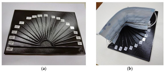 The bending of the facemask during wear may have an impact on sensor capacitance. A small decrease in sensor capacitance may be expected due to the decrease in the effective area between the interdigitated fingers during bending. With the aim of obtaining sensor capacitance at various bending angles, we made a custom, 3D-printed holder, as shown in Figure 18a. This enabled the reliable and repeatable testing of the embroidered facemask sensor, as shown in Figure 18b.