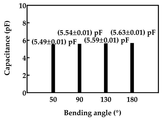 Measurements were performed for four different angles: 180° (no bending; facemask is fully stretched out), 130°, 90° and 50°, for a period of 30 s. The mean values and standard deviation were calculated. The obtained results, as shown in Figure 19, confirm a very small decrease in sensor capacitance (approximately 1% decrease per 40° bending angle), and very low standard deviation (less than 0.18%).