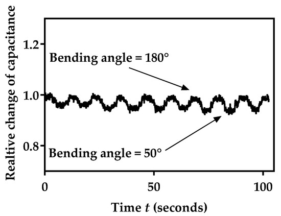 Sensor capacitance was also monitored over 10 bending cycles from the normal position without bending (180°) to the bending angle of 50°. Capacitance values over time t during 10 bending cycles, C(t), were stored and normalized to the initial value without bending (value at 180°):