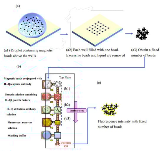 The immunoassay chip integrates various immunodetection steps in a tiny device. Among the integration techniques, the microfluidics-based immunoassay chip is a popular device because of the small liquid volumes, rapid turnaround time, and high portability offered by microfluidics [1,2,3,4,5,6,7]. Using beads as carriers, the surface area available for antigen-antibody binding is greatly increased, thereby enhancing the signal and shortening the reaction time [8,9,10,11,12,13,14,15]. For example, in 2015, Ghodbane et al. used a bead-based microfluidic chip to measure the concentration of multiple groups of human IL-1β in a channel-based microfluidic chip [8]. The required sample volume was 4.2 μL, the detection time was 5.5 h, and the detection limit was 21.8 pg/mL. The number of beads was controlled by specifying the total bead weight; the number used was more than 1000. When there were thousands of beads with a specified total weight, the deviation in bead number in each measurement represented just a small portion of the total beads. Then, the impact on the signal variations due to this small bead number deviation was also small.