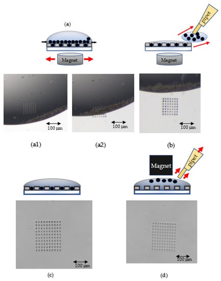 For the capture and removal of the magnetic beads, a beads droplet was first placed onto the screening chip by a pipet. Then, the pipet tip was used to drag the beads droplet backward and forward in the wells with a magnet under the chip until the wells were completely filled with the magnetic beads, as shown in Figure 2a. Finally, the excessive magnetic beads with liquid were pulled away by the pipet tip, as shown in Figure 2b,c. To remove the magnetic beads in the wells, a PL + PBS droplet (Pluronic 127/PBS = 6 mg/mL) was dropped onto the screening chip, and then a magnet was used to attract all the magnetic beads in the wells toward the top of the droplet, as shown in Figure 2d. As long as the external magnet did not touch the droplet, the surface tension could hold the magnetic beads in the droplet. The droplet and all the magnetic beads were then retrieved by the pipet.