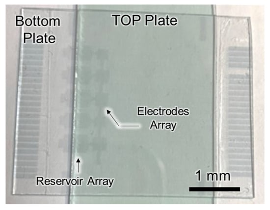 The magnetic-beads-based digital microfluidic chip was made by assembling the top plate and the bottom plate, as shown in Figure 3. The fabrication processes of the bottom plate included ITO patterning, SU-8 deposition, Al2O3 deposition, and CYTOP deposition. The ITO layer was patterned as the electrode; the SU-8 and the Al2O3 layer were the dielectric layers; and the CYTOP was the hydrophobic layer. The ITO patterning was performed through lithography and ITO etching. The etching solution was aqua regia (NHO3:HCl:H2O2 = 1:3:6). The 2.8 μm SU-8 was deposited without patterning. The 50 nm Al2O3 deposition was carried out through the in-house 8-inch ALD system developed by the Taiwan Instrument Research Institute with precursors Trimethyl aluminum (TMA) and H2O at process temperature 200 °C. The 700 nm CYTOP deposition was processed through spin-coating and baking. Then, the top plate was fabricated through the CYTOP deposition on the pattern-free ITO glass. Finally, by assembling the top plate and the bottom plate, the magnetic-beads-based digital microfluidic chip was completed. The gap between the two parallel plates was controlled by a spacer with a thickness of 65 μm, except at the detection step where the gap was reduced to 10 μm to avoid the vertical stacking of beads.