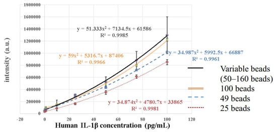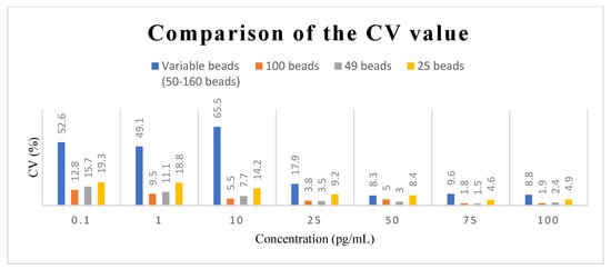 In establishing the calibration curve for human IL-1β, the known concentrations of human IL-1β samples were 0 pg/mL, 0.1 pg/mL, 1 pg/mL, 10 pg/mL, 25 pg/mL, 50 pg/mL mL, 75 pg/mL, and 100 pg/mL. There were four calibration curves, including the curve for an unfixed number of magnetic beads (50–160) and the curves for fixed numbers of magnetic beads (100, 49, and 25, respectively). In all four calibration curves, the experiments were repeated three times at each concentration for standard deviation and mean value calculations. Figure 4 shows the comparison of these four calibration curves. It was found that the fluorescence intensity became stronger with the increasing concentrations in all calibration curves, and the R2 values were all above 0.99, which meant that all four calibration curves fit the data well. However, the standard deviation of the unquantified magnetic beads was much larger, and the intensity distribution of the different concentrations even overlapped. The standard deviations of the calibration curves developed by the other three fixed numbers of magnetic beads were significantly smaller, and the fluorescence intensity distribution of different concentrations did not overlap. Figure 5 provides a comparison of the CV values of the fixed and unfixed numbers of magnetic beads at each concentration. Figure 5 indicates that with the fixed number of magnetic beads at the concentration range of 1.0 pg/mL~100 pg/mL, the CV values for 100 and 49 beads were all lower than 10%, except for the curve for 49 beads at 1.0 pg/mL, which was slightly larger than 10%. Compared to the values of the unquantified beads, the CV values for the fixed number of beads were much lower. The CV values increased when the concentration became smaller, because the total fluorescence intensity also became smaller at low concentrations. In fact, the standard deviation was not necessarily larger. When it came to 25 beads, although the standard deviation and the CV values were larger because the magnetic beads were sometimes difficult to aggregate, they were still better than those of the unquantified beads.