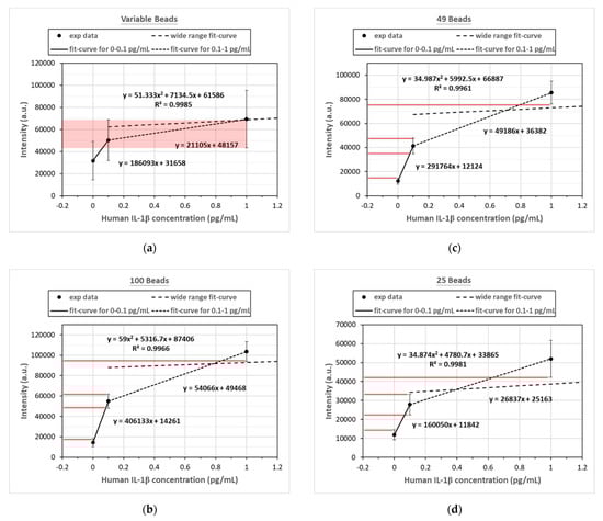 Figure 6 shows the difference in measured fluorescence intensity at the low concentrations of 0.0 pg/mL, 0.1 pg/mL, and 1.0 pg/mL between the fixed and unfixed number of magnetic beads. When the number of magnetic beads was unfixed, as shown in Figure 6a, the signals of two concentrations partially overlapped, and it was difficult to accurately differentiate 1.0 pg/mL from 0.1 pg/mL. Figure 6b–d show obvious differences when the bead number was fixed at 100, 49, or 25. The measured fluorescent signals did not overlap, and could clearly distinguish 0.0 pg/mL, 0.1 pg/mL, and 1.0 pg/mL. However, the wide-range calibration curves did not fit the experiment data very well at low concentrations. In order to have better fitting curves at low concentrations, composite linear curves passing through experiment data points at low concentrations were proposed. This meant that one linear equation linked experiment data at 0.0 pg/mL and 0.1 pg/mL, and another linear equation linked experiment data at 0.1 pg/mL and 1.0 pg/mL, as shown in Figure 6. In this way, these linear calibration curves for the low concentrations could exactly fit the experimental data points at 0.0 pg/mL, 0.1 pg/mL, and 1.0 pg/mL. The calculated intensities at these three concentrations were identical to the measured values.