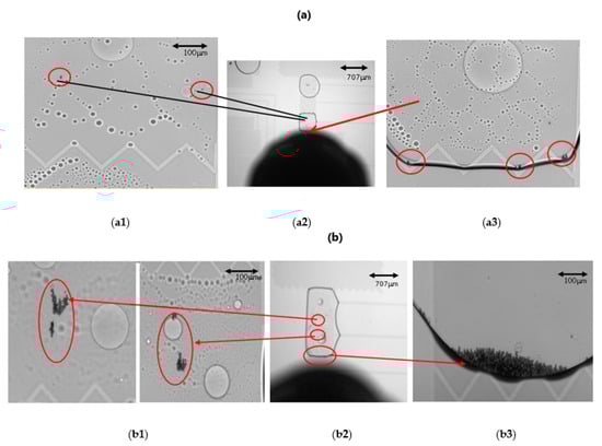 When the number of magnetic beads was more than 500, as shown in Figure 8b, it was easy for the beads to become stuck in the 10 μm gap between the upper and lower plates because too many magnetic beads caused immobility. Figure 8(b2) shows the droplet containing magnetic beads on the detection electrode; the black part is the external magnet. Figure 8(b1) is an enlarged view of part of the droplet, and the circled part is the magnetic beads that were stuck and could not be moved. Figure 8(b3) is an enlarged view of the bottom of the droplet, showing that some of the magnetic beads were successfully aggregated.