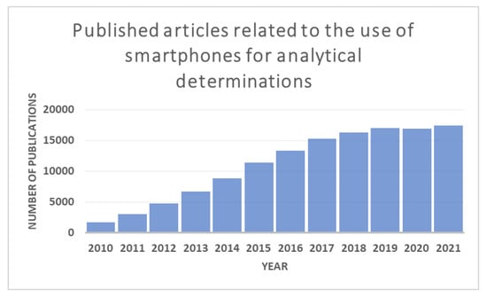 According to a study conducted and compiled by two online marketing and communication agencies, We are Social and Hootsuite, in the report Digital 2021 in January 2021 [2], there are about 5.22 billion mobile phone users, which covers 66.6% of the world population. These data show the ubiquity of smartphones and explain why the use of these devices as an analytical tool has grown significantly in the last twelve years [3] (Figure 1). The versatility and ease with which a smartphone is used have led to the development of numerous control analyses: mercury, nitrites, or fluoride in water samples, iron (III) in bioethanol fuel, and formaldehyde in cosmetic products, among many others [4,5,6,7,8,9,10,11,12].