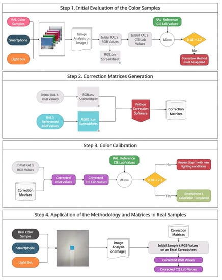Flowchart for the correction of color samples. The methodology is based on a four-step process: (1) Initial evaluation of the color samples using CIE∆E2000, (2) Correction matrices generation with the Python-based software, (3) Color calibration by applying the matrices generated to the color samples, (4) Application of the methodology and matrices in real samples.