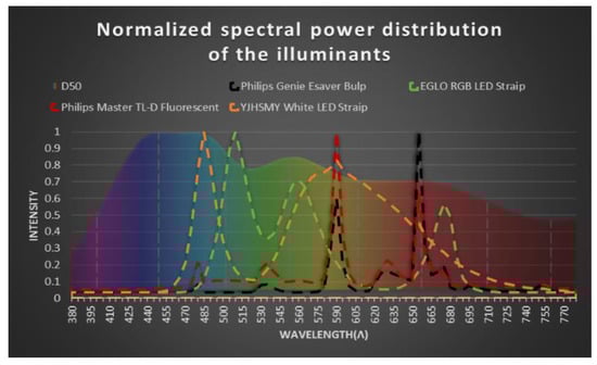 Indirect constant artificial lighting was used for the color measurement: Genie Esaver Bulp by Philips (Amsterdam, The Netherlands) (11 W), Master TL-D Fluorescent by Philips (The Netherlands) (36 W), 6500 K warm white dimmable LED by EGLO (Austria) (7.5 W) and 5050 K white LED by YJHSMT (China) (8 W). Their spectral power distributions (SPD) were characterized in the range of 380–780 nm and measured with an arrangement composed of an optical fiber (Ocean Optics QP600-1-sR) and a compact monochromator (Ocean Optics QE-65,000).