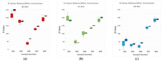 Finally, 5 samples from the 10 chosen for the study were randomly chosen (Samples 1, 3, 6, 7, and 9), and the RGB values of each device were represented on a box and whisker plot, comparing these values before and after the correction so that the variability of the measurements could be noticed (Figure 5a–c). This process will allow evaluation of the validity of the correction method and, if it is feasible, to apply it to real color samples.