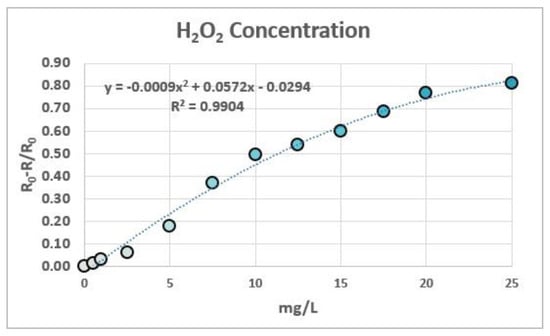 For the determination of peroxides in these strips, 12 solutions of known concentration were prepared and measured to generate a calibration plot, representing R0-R/R0 vs. the peroxide concentration values (Figure 6). The R coordinate of the RGB system was chosen as an indicator of the color differences between measures due to the capacity of the colorant to absorb at the wavelength of 650 nm. As was previously demonstrated in previous papers [13,14], a second-order degree polynomial relationship between (R0-R)/R0 and the concentration of the chromophore is theoretically expected.