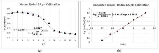 Once the logistic and the linearized form functions of the measurements were obtained (Figure 8a,b), 4 different buffer solutions were selected from the laboratory to determine their pH value. Each buffer was measured 3 times with 3 different smartphones. The study results (Table 9) were obtained by interpolating the x value of the CIE xy system of each sample in the linearized form of the logistic function.