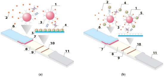 Scheme of the (a) standard and (b) proposed alternative competitive LFIAs. 1—Gold nanoparticles; 2—antigen in the sample; 3—antibodies against the antigen; 4—carrier protein; 5—antigen conjugated with carrier protein; 6—sample application membrane; 7—conjugate application membrane; 8—working nitrocellulose membrane; 9—analytical zone; 10—control zone; 11—final adsorbing membrane.