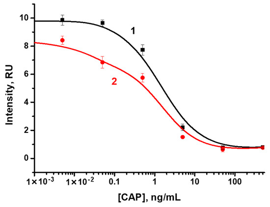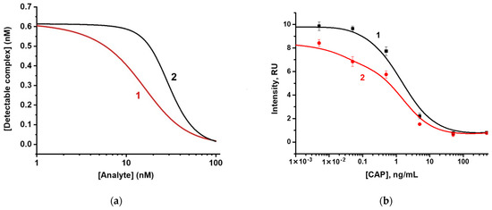(a) Theoretical calibration curves for (1) double competitive LFIA and (2) standard competitive LFIA. Model parameters: T = 30 s; t = 300 s; kai = 106 1/(M × s); kdi = 10−4 1/s. 1—[C]0 = 10 nM; [P]0 = 20 nM; [R]0 = 1 nM; 2—[P]0 = 20 nM; [R]0 = 0.62 nM. (b) Color intensity in the analytical zones of test strips (from Figure 5) for the determination of CAP in the (1) standard scheme of competitive LFIA and (2) proposed scheme of double competitive LFIA (b).