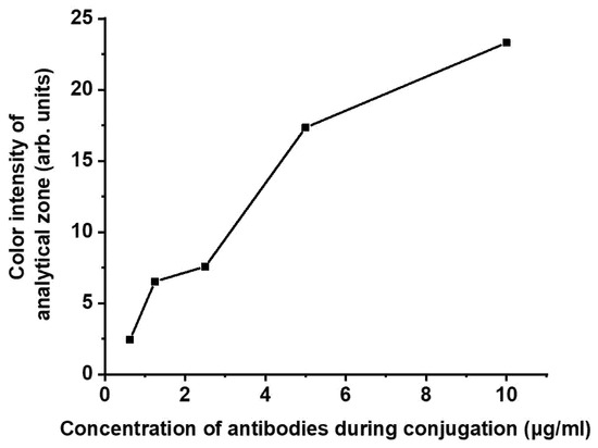 Since labeled antibody concentration was stated as the parameter influencing the assay sensitivity, we have studied the dependence of color intensity in the analytical zone on the concentration of antibodies conjugated with nanoparticles. The obtained results (Figure 4) demonstrate that decreasing antibody concentration leads to a decrease in maximal coloration in the analytical zone, but the assay sensitivity is increased [25,27]. Thus, to compare the LOD of both schemes, we have implemented the analyses under conditions providing a similar color intensity of the analytical zone in the absence of the analyte.