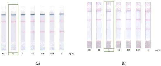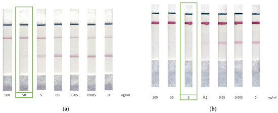 The LFIA for CAP solutions with concentrations from 0.005 to 500 ng/mL was carried out under the selected conditions. According to the obtained results, visual LOD, corresponding to the disappearance of coloration in the analytical zone, was 50 ng/mL (Figure 5a). The double competitive LFIA demonstrated visual LOD of 5 ng/mL (Figure 5b). Instrumental LOD, calculated according to the 3σ criterion, was observed at a concentration of 400 pg/mL and dynamic range from 0.28 to 10.88 ng/mL (R2 = 0.95874) and at a concentration of 20 pg/mL and dynamic range from 0.03 to 0.23 ng/mL (R2 = 0.99493) in the standard and proposed scheme, respectively (Figure 3b).