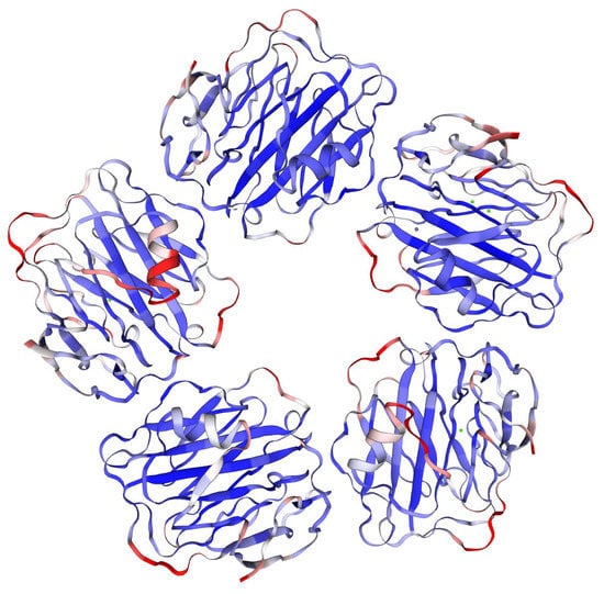 CRP belongs to an evolutionarily conserved protein family of pentraxin with specifications close to the other family members. In humans, the whole molecule weighs around 120 kDa and it comprises five identical subunits (homopentamer), each sized 206 amino acids [16]. The weight of CRP can differ depending on its origin and cited study. Considering the significance of CRP in both human and veterinary medicine, molecular weights of CRP from various organisms should be taken into consideration when a new analytical method for CRP is established with a principle based on molecule or its fragments weighting (e.g., mass spectrometry). The molecular weight of a subunit between 20 and 30 kDa and a total range of 100–150 kDa for the whole molecule can be found in the literature for CRP over various mammals [16,17,18]. The final molecule of CRP is composed of five subunits arranged into a circle plain shape with central space [19,20,21,22]. The pentameric structure of CRP can be determined from X-ray crystallography structures. An X-ray crystallographic structure made by Guillon and coworkers [23] and visualized using the SWISS-MODEL online application [24,25,26] is given in Figure 1.