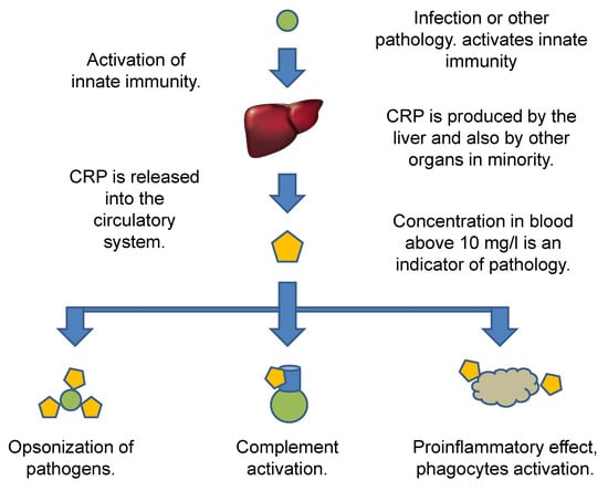 The opsonization of pathogens and target cells is the major task for CRP and it results in the activation of further steps leading to killing pathogens and inactivating damaged cells [30]. The CRP is part of the inflammatory reactions in the organism further stimulating immunity, including macrophages and promoting phagocytosis by professional phagocytes, preventing infections and other malignancies, but the CRP can also be involved in autoimmune disorders [31]. The blood circulating form of CRP is dominantly a homopentamer, which can associate with phosphocholine-rich membranes of immune cells and cells undergoing apoptosis, can dissociate to the subunits that are further involved in both classic and alternative complements, and can activate leukocytes [32]. A survey of the CRP pathway and initiated effects is given in Figure 2.