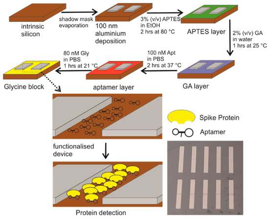 Schematic of the functionalisation process and subsequent detection of the spike protein. An aluminium contact is deposited on an intrinsic silicon sample. The device is functionalised with APTES, glutaraldehyde (GA), aptamer and glycine molecules in this order. The glycine is aimed at terminating any unbound aldehydes, which might create non-specific binding sites. In the final step, the process of detection is visualised inside the electrode gap. For clarity the aptamers and protein are only shown in the area between the electrodes; however, they are present everywhere on the silicon. At the bottom right is a photograph of the actual devices.