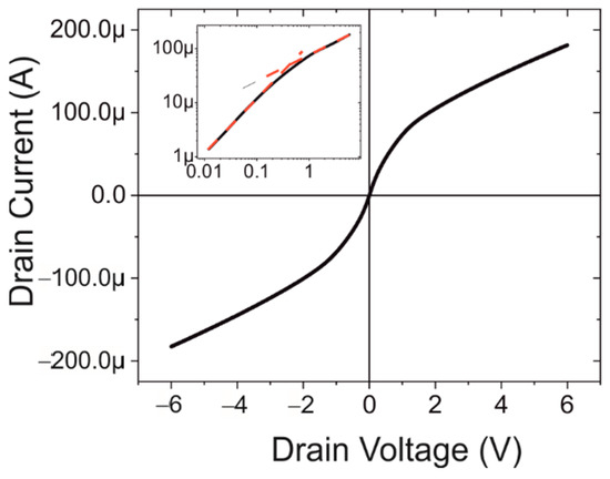 The inset in Figure 2 shows the data on a log-log plot. Two different regimes are apparent. The first regime at low voltages (<0.1 V) has a slope of approximately 1 indicating the expected Ohmic region of FET characteristics. This is followed by the final pinch-off region where the slope decreases to 0.5, the saturation region.