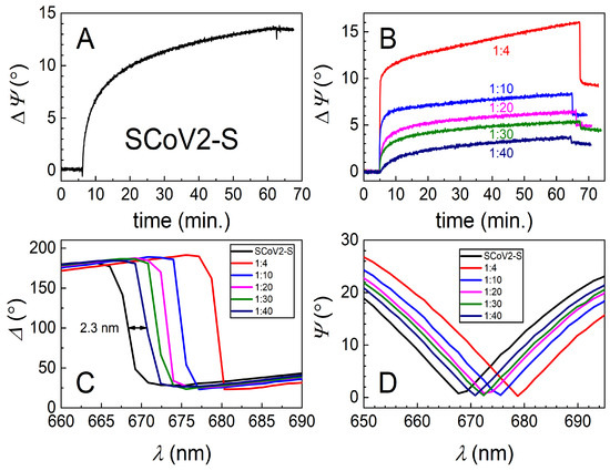 Time-resolved TIRE kinetics and ellipsometric parameters of SCoV2-S immobilization and interaction with specific polyclonal antibodies. (A) Kinetics of covalent SCoV2-S immobilization on 11-MUA SAM modified gold-coated SPR sensor disc; (B) kinetics of polyclonal antibody interaction with covalently immobilized ScoV2-S at different serum dilutions (1:4, 1:10, 1:20, 1:30, and 1:40); (C) Δ and (D) Ψ spectral shift after immune complex formation using the same dilutions of polyclonal antibodies.