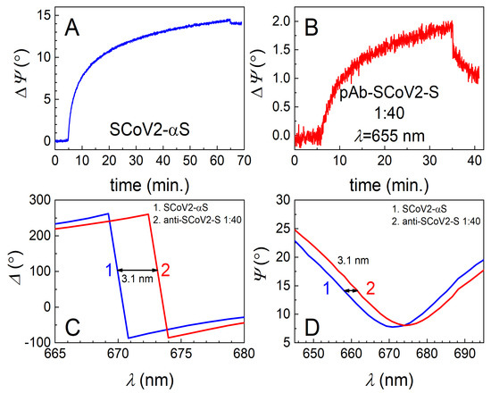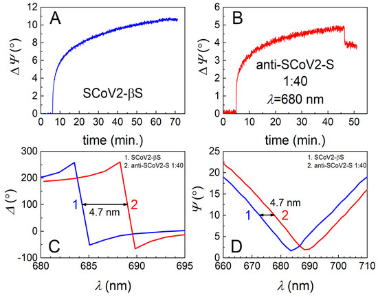 For the investigation into the immune complex formation between SCoV2-αS and pAb-SCoV2-S, SCoV2-αS was covalently immobilized on the 11-MUA SAM, and this immobilization kinetics was recorded using TIRE (Figure 3A). During the interaction between the covalently immobilized SCoV2-αS with a 0.849 nM concentration of pAb-SCoV2-S antibodies (the formation of the SCoV2-αS/pAb-SCoV2-S immune complex), the change in the ellipsometric parameter ΔΨ was 2.01°, and the spectral shift of Δ and Ψ vs. λ was 3.1 nm to longer wavelengths. Furthermore, the covalent immobilization of SCoV2-βS on the 11-MUA SAM was performed, and immobilization kinetics was recorded using TIRE (Figure 4A). The immune complex formation kinetics, using the same pAb-SCoV2-S antibody concentration (0.849 nM), and the covalently immobilized SCoV2-βS was recorded. After the immune complex formation, the change in ΔΨ was 4.96° (Figure 4B), and a 4.7 nm spectral shift in Δ and Ψ vs. λ (Figure 4C,D) was observed.