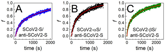 Normalized pAb-SCoV2-S antibody surface concentration (f) evolution in time obtained using 1:40 diluted blood serum during the formation of the immune complex with (A) SCoV2-S, (B) SCoV2-αS, (C) SCoV2-βS. Points correspond to experimentally obtained results, while lines for fitting are derived by using two-step irreversible binding immune complex formation mathematical modeling.