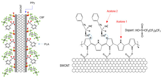 To solve these problems, we synthesized core–shell-shaped carbon nanocomposites comprising a single-walled carbon nanotube (SWCNT) core and heptadecafluorooctanesulfonic acid-doped polypyrrole (C8F-doped-PPy)/phenyllatic acid (PLA) shells, i.e., C8F-doped-PPy/PLA@SWCNT, for C3H6O gas sensing at a sub-ppm level at room temperature and in stable humidity (see Figure 1). Structurally, it is a rod-shaped conductive carbon nanocomposite in which single-strand SWCNTs are embedded in C8F-doped-PPy, and the surface of C8F-doped-PPy is surrounded by PLA molecules that selectively react to C3H6O gas. Specifically, C8F is arranged on the surface of conductive PPy and acts as a dopant that not only affects the electrical resistance value, but also minimizes the changes in resistance due to moisture because of its hydrophobic properties. Recently, these chemical sensors based on π-conjugated conductive carbons (CCCs), such as carbon nanotubes (CNTs) [18,19,20], PPy [21,22,23], polyaniline [24], and graphene [25], are receiving a lot of attention as a gas-sensing material due to their changes in resistance when reducing or oxidizing gases are absorbed. The electrical resistance of these CCCs affects conductivity as the transfer of charged carriers within the π-conjugated chain and their resistance is changed by the adsorption of gas species. That is, when the CCC-based sensor is exposed to a gas such as C3H6O, their resistance is reduced in proportion to the concentration of the adsorbed gas. These organic-based C3H6O sensors have two advantages: they always respond at room temperature and can be easily designed as a material with high selectivity and sensitivity. Recently, Chung et al. [2] reported a C3H6O sensor based on cylindrical nanopore carbon composite with enhanced responsiveness down to the ppb level.