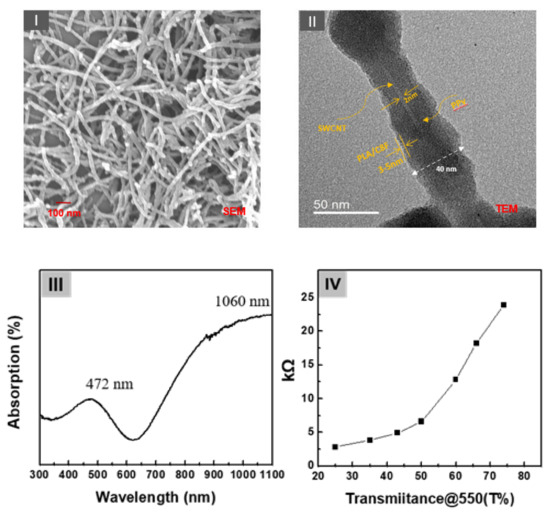 (I) The scanning electron microscopy (SEM) and (II) transmission core–shell-shaped nanorods (sample). (III) The surface plasmon absorption spectrum of the samples and (IV) the electrical resistance (Ω) of the sensor sample of the as-cast film formed as a function of the relative thickness (thickness converted concerning the light transmittance (%) at a 550 nm wavelength of the casting film).