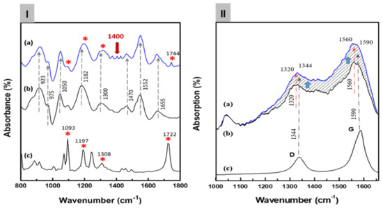 (I) The Fourier transform infrared (FT-IR) spectra of the C8F-doped-PPy/PLA@ SWCNT nanocomposite: (a) the C8F-doped-PPy/PLA@ SWCNT composite, (b) the C8F-doped PPy@SWCNT nanorods, and (c) the PLA. In the figure, the meaning of ‘*’ indicates the IR absorp-tion peak of PLA molecules. The presence or absence of PLA present in the surface layer of C8F-doped-PPy/PLA@ SWCNT nanocomposite is expressed. (II) The FT-Raman spectra of the C8F-doped-PPy/PLA@ SWCNT nanocomposite: (a) the C8F-doped-PPy/PLA@ SWCNT composite, (b) the C8F-doped-PPy nanorods, and (c) the SWCNT. (The dotted line indicates that the Raman intensity changed as the stretching mode of C8F-doped-PPy and the tangential mode of SWCNT overlapped).