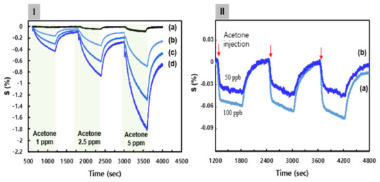 Noninvasive and portable breath analysis sensors are of increasing interest for monitoring a variety of diseases, including diabetes [1,2,3,4,5]. The breath that a normal person exhale contains approximately 5% water (H2O) vapor and carbon dioxide (CO2); approximately 1 ppm ammonia (NH3); and ~1 ppm acetone (C3H6O), methanol (CH3OH), ethanol, and other volatile organic compounds. Among these exhaled gases, the concentration of C3H6O is related to metabolism. Moreover, it has been reported that a strong association exists between the concentration of C3H6O in the breath and the rate of body fat loss [6,7,8,9]. Additionally, breath C3H6O is regarded as a biomarker for diabetes [9,10,11]. In general, the concentration of breath C3H6O in healthy individuals is below 1 ppm, but in diabetic patients, this can be twice as much. However, there are still major challenges for disease-detection sensors using respiratory gases, as follows: (1) the responsiveness of ppb levels is required because of the low concentration of the gases in the breath; (2) high selectivity is needed because of the complex composition of the breath, which includes a large quantity of moisture; and (3) for practical applications, such as point of care, the sensor must be instantaneous, easy to use, and portable and must function at a low operating temperature.