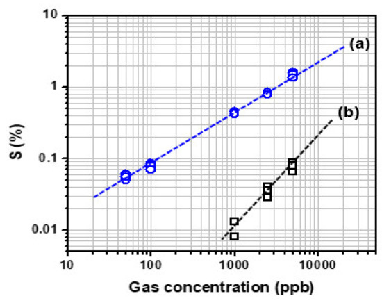 The sensitivity of the (a) C8F-doped-PPy/PLA0.5@SWCNT sensor and (b) C8F-doped-PPy/PLA0.0@SWCNT sensor observed by exposure to 50–5000 ppb of C3H6O gas.