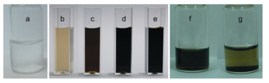 Photographs of electrolyte solutions before (a) and after the electro-exfoliated process in 0.01 M of NaOH solution and conditioned at various temperatures of (b) 0 °C, (c) 20 °C, (d) 30 °C, and (e) 40 °C for 3. Photograh (f) is the “e” stored at 6 months, and after adjusting into acidic condition (pH = 3) (g).