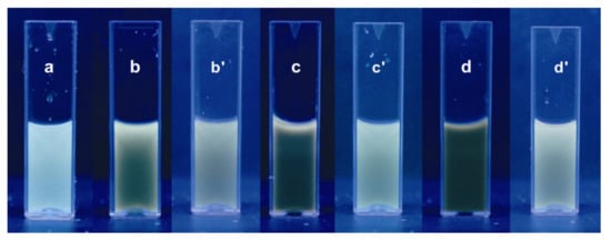 Photographs of the fluorescence of CNP solutions obtained by the electrochemical exfoliation reaction at temperatures of (a) 0 °C, (b) 20 °C, (c) 30 °C, and (d) 40 °C. Photographs of (b’), (c’) and (d’) are 4, 8, and 16 dilutions of the respective solutions.