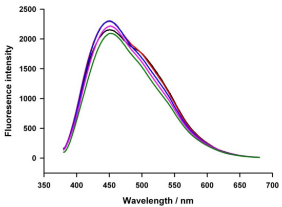 Emission spectra of CNP solutions (40 °C Preparation) at different excitation wavelengths of 310 nm (black line), 320 nm (red line), 330 nm (blue line), 340 nm (pink line), and 350 nm (green line), respectively.
