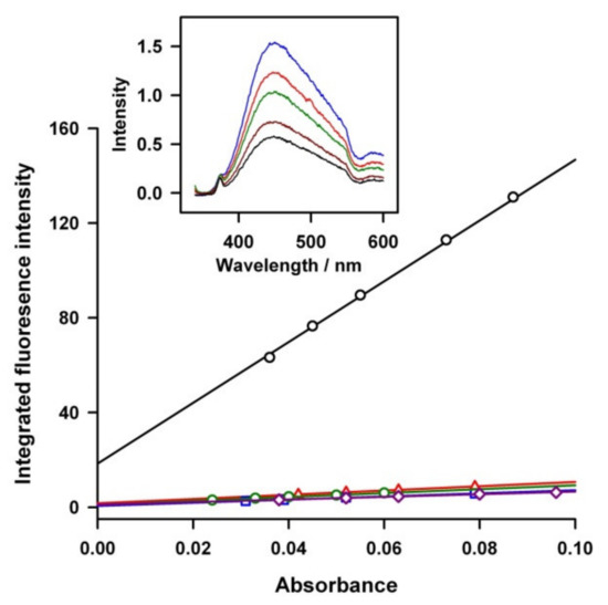 Plots of integrated photoluminescence intensity vs. absorbance of the various nanosized carbon particles, and quinine sulphate (black circle) (diluted samples). The red triangle, blue square, green circle, and purple diamond symbols are the CNPs of electro-exfoliated samples prepared at temperatures of 0 °C, 20 °C, 30 °C, and 40 °C, respectively. The inserted graph is a fluorescence emission spectra of CNPs (average diameter of 1 nm) with various dilution ratios.