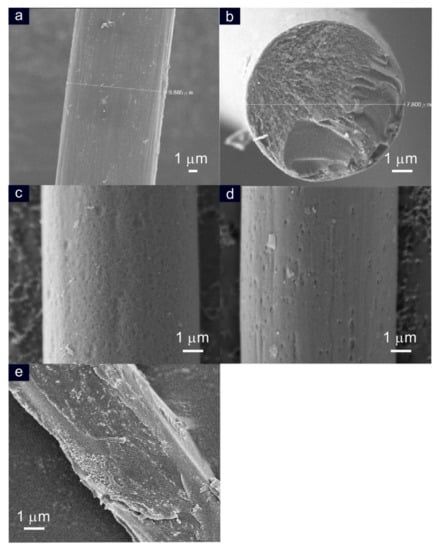 Figure 5a is an SEM image of carbon fiber before the electro-exfoliation experiment. A longitudinal fiber of diameter size 9.8 µm with a smooth morphology structure was noticed. Figure 5b–e are typical SEM images of the electrochemically exfoliated carbon fiber at various solution-phase conditions, such as 0.1 M of H3PO4 (b), 0.1 M pH 7 phosphate buffer solution (c), 0.01 M of NaOH (d), and 0.01 M of NaOH + 0.1 M of H3PO4 (e). A typical cross-sectional surface view of the carbon fiber conditioned at 0.1 M of H3PO4 is shown in Figure 5b. A porous interface morphology, which may be due to the exfoliation treatment, was noticed. Meanwhile, for the case of the 0.1 M PBS (pH = 7) conditioned system, a homogenous and minor porous surface structure like carbon fiber was observed (Figure 5c). This observation is true with the 0.01 M of NaOH system as well (Figure 5d). On the other hand, marked cracks with apparently deep grooves (leading to the rough surface) were found upon the electro-exfoliation of carbon fiber under the 0.01 M of NaOH + 0.1 M of PO43− solution (Figure 5e). Based on the previous literature relating to the solvent effect and external influencing conditions, it can be concluded that specific phosphate ion intercalation, temperature gradient, and electrochemical stress generated on the carbon fiber electrolyte interface are responsible factors for the facile electrochemical exfoliation of carbon nanoparticles as graphitic structures from the fiber [32,33] (Scheme 1A–C). Furthermore, it has been reported that hydroxyl and oxygen radicals that have been generated at a high oxidation potential (2 V vs. Ag/AgCl) (Scheme 1B) attack the graphite edge planes, facilitating the intercalation of PO43− anion with carbon nanofiber, and further contribute to the dissolution of hydroxylated carbon nanoparticles [11]. Since the 0.01 M of NaOH + 0.1 M of H3PO4 condition showed the best exfoliation process as compared to the other conditions, it was fixed as an optimal condition for further experiments.