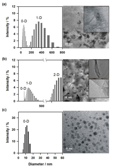 To support the experimental observation, controlled electrochemical exfoliation experiments with individual electrolytes such as 0.01 M of NaOH, 0.1 M of PO43−, and 0.01 M of NaOH + 0.1 M of PO43− were carried out at a fixed temperature of 40 °C, respectively. For the case of the 0.01 M of NaOH solution, two size distribution zones corresponding to sphere-like carbon nanoparticles and tube-like carbon nanoparticles were observed, respectively (Figure 7a). Similarly, for the case of the 0.1 M of PO43− condition, three size distribution zones were observed corresponding to sphere-like carbon nanoparticles, tube-like carbon nanoparticles (211.9 ± 37.7 nm), and thin graphites (i.e., multilayer graphene, 1136.2 ± 241.8 nm), respectively (Figure 7b). The experimental observation of mixed carbon nanoparticle formation is true for the majority of literature reports [37,38]. Plausibly, an uncontrolled method of electrochemical exfoliation reaction is the likely reason for the observation. Interestingly, sphere-like monodispersed carbon nanoparticles with a reduced particle size of 13.3 ± 3.8 nm were observed in the solution of 0.01 M of NaOH + 0.1 M of PO43− (Figure 7c). In connection with the observation, Toyoda’s group has reported the effect of PO43- in the chemical exfoliation of carbon fiber at 1000 °C [39]. It has been pointed out that the sp2-bonded carbon network, together with carbon–oxygen surface groups at the edges with the OH− ions intercalated in the interlaminar space like carbon nanomaterials, was formed.
