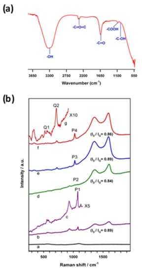 Figure 8b is comparative Raman spectroscopic data of CNPs prepared at different temperatures. Qualitatively similar Raman patterns were noticed due to graphitic (D-band, sp2 carbon) and disordered graphitic (G-band, sp3 carbon) structures at frequencies of 1344 cm−1 and 1650 cm−1, respectively. The ratio of the intensities of D and G bands, ID/IG is commonly used to estimate the degree of the perfection of the graphene structure [40]. It is expected that the electrochemical exfoliations led to a marked edge plane (a strong D peak) on the surface of carbon nanoparticles (as shown as ID/IG ratios in Figure 8b(b–f)). Calculated ID/IG values are 0.89, 0.84, 0.89, and 0.86, respectively. Nearly the same ID/IG value noticed against the various preparation temperature may indicate a similar qualitative structure of the carbon nanoparticle prepared in this work. Indeed, the specific pre-peaks (T-peaks) noticed around 1026 cm−1 with high-temperature samples, which were due to the UV excitation peak, indicate intense graphitic structure formation with those samples [41,42].